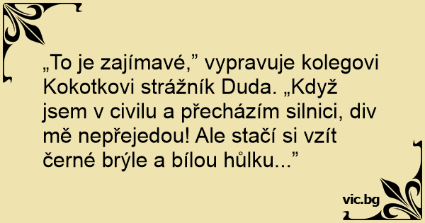 „To je zajímavé,” vypravuje kolegovi Kokotkovi strážník Duda. „Když jsem v civilu a přecházím silnici, div mě nepřejedou! Ale stačí si vzít černé brýle a bílou hůlku...”