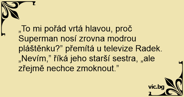 „To mi pořád vrtá hlavou, proč Superman nosí zrovna modrou pláštěnku?” přemítá u televize Radek.