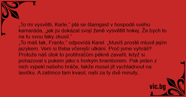 „To mi vysvětli, Karle,” ptá se štamgast v hospodě svého kamaráda, „jak jsi dokázal svojí ženě vysvětlit hokej. Že bych to na tu svou taky zkusil.”