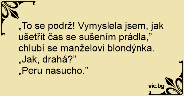 „To se podrž! Vymyslela jsem, jak ušetřit čas se sušením prádla,” chlubí se manželovi blondýnka.