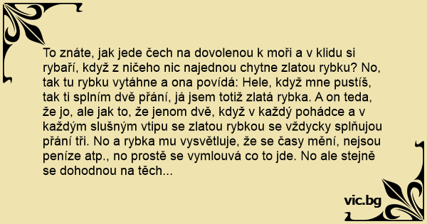 To znáte, jak jede čech na dovolenou k moři a v klidu si rybaří, když z ničeho nic najednou chytne zlatou rybku? No, tak tu rybku vytáhne a ona povídá: Hele, když mne pustíš, tak ti splním dvě přání, já jsem totiž zlatá rybka. A on teda, že jo, ale jak to, že jenom dvě, když v každý pohádce a v každým slušným vtipu se zlatou rybkou se vždycky splňujou přání tři. No a rybka mu vysvětluje, že se časy mění, nejsou peníze atp., no prostě se vymlouvá co to jde. No ale stejně se dohodnou na těch dvou přáních, a rybka povídá: Tak si teda přej svoje první přání. A čech se zadívá do zapadajícího slunce nаd mořem a říká: Tak já si teda přeju, aby to moře bylo plný piva. Staniž se, řekla ryba a stalo se. A to druhý přání? ptá se ryba. čech se zase zamyslí a říká: Ještě tři lahváče na ráno!