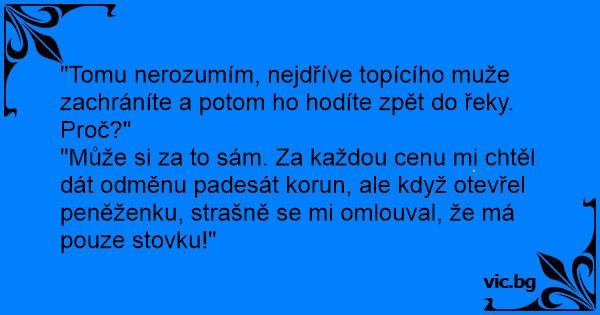 "Může si za to sám. Za každou cenu mi chtěl dát odměnu padesát korun, ale když otevřel peněženku, strašně se mi omlouval, že má pouze stovku!"