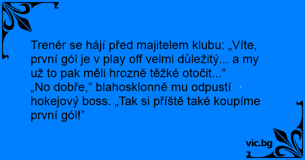 „No dobře,” blahosklonně mu odpustí hokejový boss. „Tak si příště také koupíme první gól!”