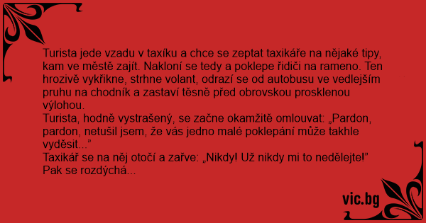 Taxikář se na něj otočí a zařve: „Nikdy! Už nikdy mi to nedělejte!” Pak se rozdýchá a povídá: „Není to úplně vaše vina. Víte, jsem dneska první den v nové práci a před tím jsem léta jezdil s pohřebákem.”
