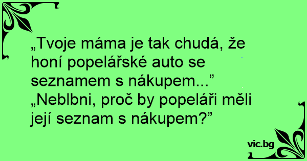 „Tvoje máma je tak chudá, že honí popelářské auto se seznamem s nákupem...”<br />„Neblbni, proč by popeláři měli její seznam s nákupem?”
