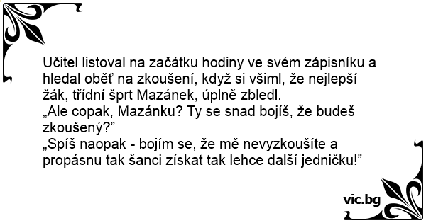 Učitel listoval na začátku hodiny ve svém zápisníku a hledal oběť na zkoušení, když si všiml, že nejlepší žák, třídní šprt Mazánek, úplně zbledl.