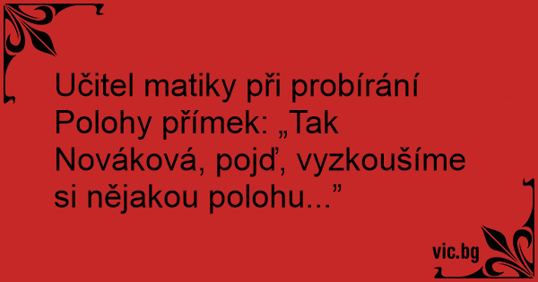 Učitel matiky při probírání Polohy přímek: „Tak Nováková, pojď, vyzkoušíme si nějakou polohu...”