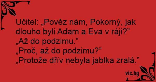 Učitel: „Pověz nám, Pokorný, jak dlouho byli Adam a Eva v ráji?”