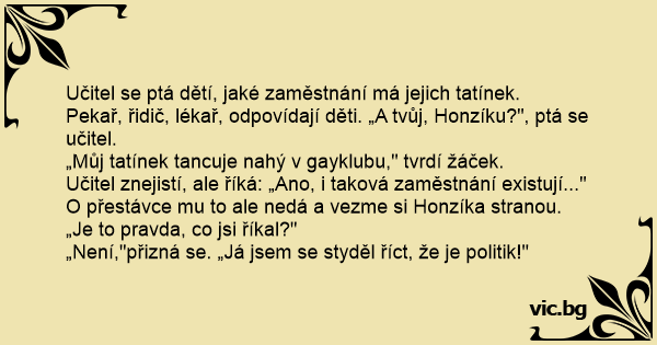 Pekař, řidič, lékař, odpovídají děti. „A tvůj, Honzíku?", ptá se učitel.