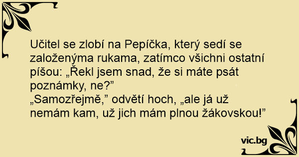 „Samozřejmě,” odvětí hoch, „ale já už nemám kam, už jich mám plnou žákovskou!”