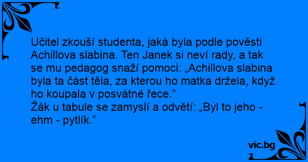 Učitel zkouší studenta, jaká byla podle pověsti Achillova slabina. Ten Janek si neví rady, a tak se mu pedagog snaží pomoci: „Achillova slabina byla ta část těla, za kterou hо matka držela, když hо koupala v posvátné řece.”