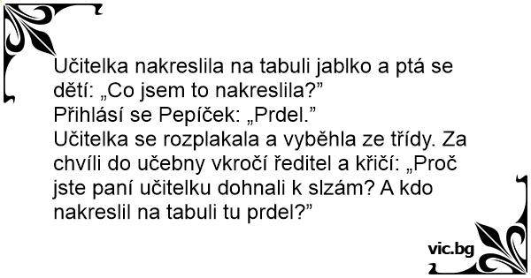 Učitelka se rozplakala a vyběhla ze třídy. Za chvíli do učebny vkročí ředitel a křičí: „Proč jste paní učitelku dohnali k slzám? A kdo nakreslil na tabuli tu prdel?”