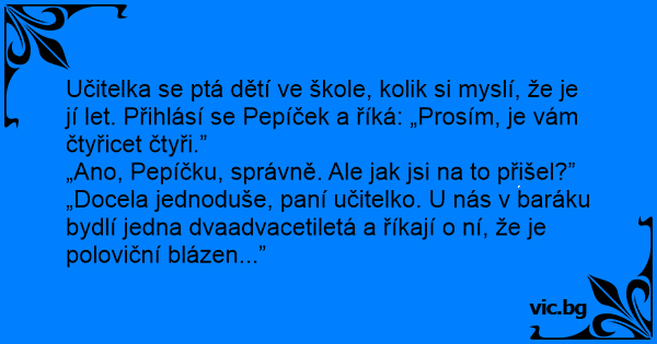 Učitelka se ptá dětí ve škole, kolik si myslí, že je jí let. Přihlásí se Pepíček a říká: „Prosím, je vám čtyřicet čtyři.”