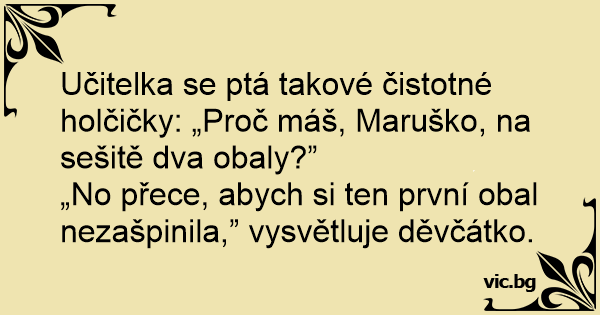 Učitelka se ptá takové čistotné holčičky: „Proč máš, Maruško, na sešitě dva obaly?”