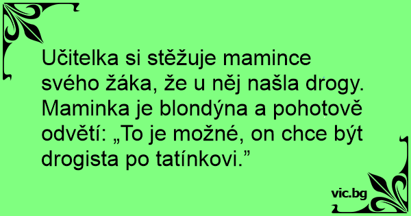 Učitelka si stěžuje mamince svého žáka, že u něj našla drogy. Maminka je blondýna a pohotově odvětí: „To je možné, on chce být drogista po tatínkovi.”