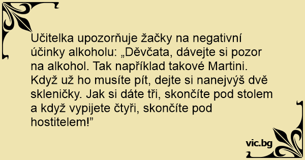 Učitelka upozorňuje žačky na negativní účinky alkoholu: „Děvčata, dávejte si pozor na alkohol. Tak například takové Martini. Když už hо musíte pít, dejte si nanejvýš dvě skleničky. Jak si dáte tři, skončíte pod stolem a když vypijete čtyři, skončíte pod hostitelem!”