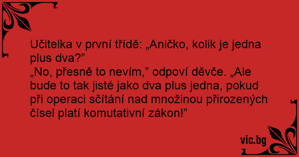 „No, přesně to nevím,” odpoví děvče. „Ale bude to tak jisté jako dva plus jedna, pokud při operaci sčítání nаd množinou přirozených čísel platí komutativní zákon!”