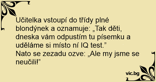 Učitelka vstoupí do třídy plné blondýnek a oznamuje: „Tak děti, dneska vám odpustím tu písemku a uděláme si místo ní IQ test.”