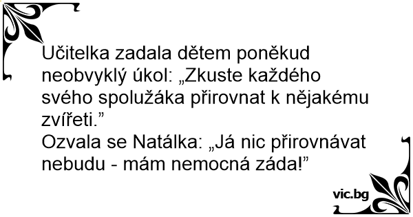 Učitelka zadala dětem poněkud neobvyklý úkol: „Zkuste každého svého spolužáka přirovnat k nějakému zvířeti.”