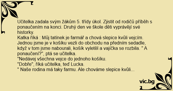 Katka říká : Můj tatínek je farmář a chová slepice kvůli vejcím. Jednou jsme je v košíku vezli do obchodu na předním sedadle, když v tom jsme nabourali, košík vyletěl a vajíčka se rozbila. " A ponaučení?", ptá se učitelka.