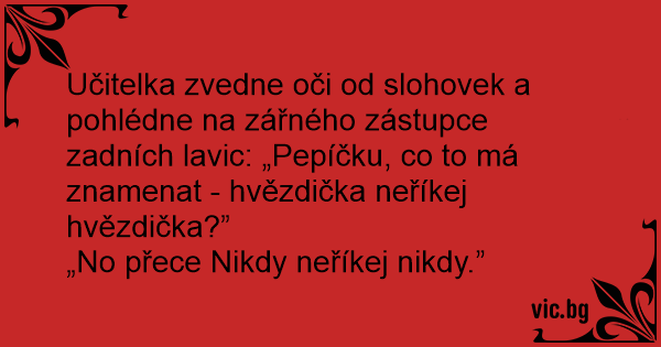 Učitelka zvedne oči od slohovek a pohlédne na zářného zástupce zadních lavic: „Pepíčku, co to má znamenat - hvězdička neříkej hvězdička?”