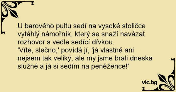 'Víte, slečno,' povídá jí, 'já vlastně ani nejsem tak veliký, ale my jsme brali dneska služné a já si sedím na peněžence!'