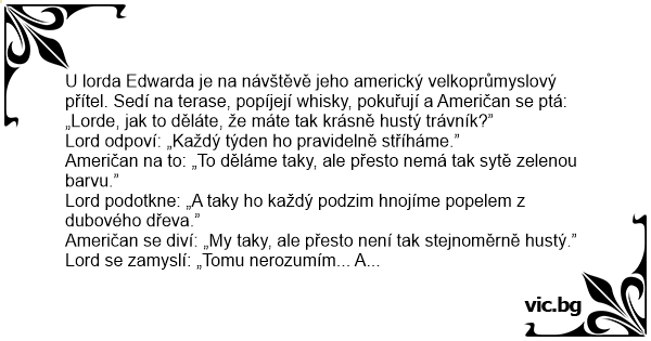 U lorda Edwarda je na návštěvě jeho americký velkoprůmyslový přítel. Sedí na terase, popíjejí whisky, pokuřují a Američan se ptá: „Lorde, jak to děláte, že máte tak krásně hustý trávník?”