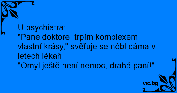 "Pane doktore, trpím komplexem vlastní krásy," svěřuje se nóbl dáma v letech lékaři.