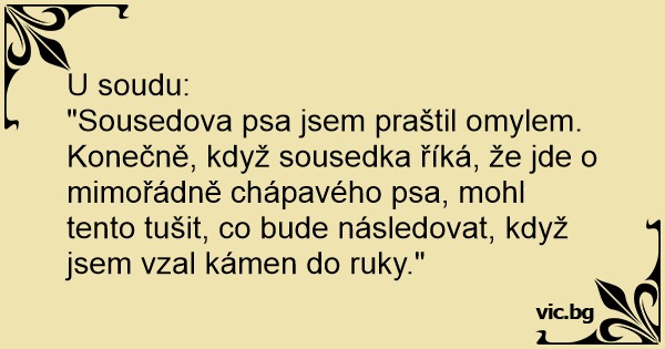 "Sousedova psa jsem praštil omylem. Konečně, když sousedka říká, že jde o mimořádně chápavého psa, mohl tento tušit, co bude následovat, když jsem vzal kámen do ruky."