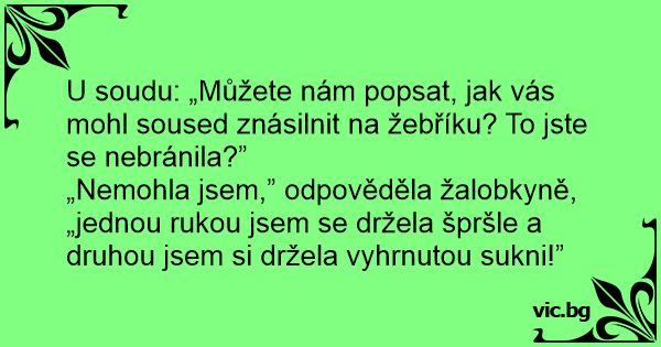 „Nemohla jsem,” odpověděla žalobkyně, „jednou rukou jsem se držela špršle a druhou jsem si držela vyhrnutou sukni!”