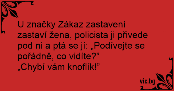 U značky Zákaz zastavení zastaví žena, policista ji přivede pod ni a ptá se jí: „Podívejte se pořádně, co vidíte?”