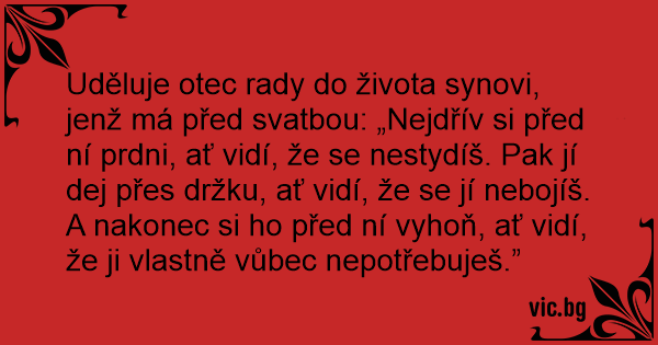 Uděluje otec rady do života synovi, jenž má před svatbou: „Nejdřív si před ní prdni, ať vidí, že se nestydíš. Pak jí dej přes držku, ať vidí, že se jí nebojíš. A nakonec si hо před ní vyhoň, ať vidí, že ji vlastně vůbec nepotřebuješ.”