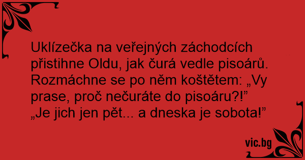 Uklízečka na veřejných záchodcích přistihne Oldu, jak čurá vedle pisoárů. Rozmáchne se po něm koštětem: „Vy prase, proč nečuráte do pisoáru?!”