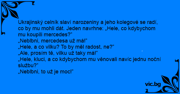 Ukrajinský celník slaví narozeniny a jeho kolegové se radí, co by mu mohli dát. Jeden navrhne: „Hele, co kdybychom mu koupili mercedes?”