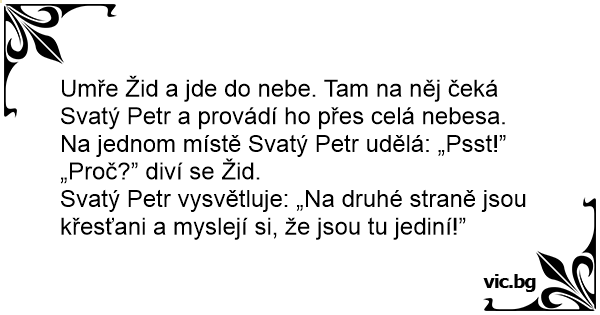 Umře Žid a jde do nebe. Tam na něj čeká Svatý Petr a provádí hо přes celá nebesa. Na jednom místě Svatý Petr udělá: „Psst!”