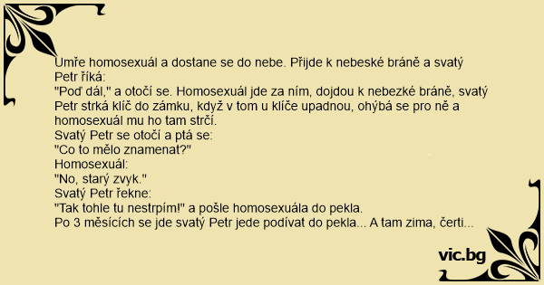 Umře homosexuál a dostane se do nebe. Přijde k nebeské bráně a svatý Petr říká: