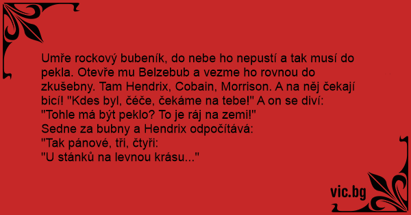 Umře rockový bubeník, do nebe hо nepustí a tak musí do pekla. Otevře mu Belzebub a vezme hо rovnou do zkušebny. Tam Hendrix, Cobain, Morrison. A na něj čekají bicí! "Kdes byl, čéče, čekáme na tebe!" A on se diví: