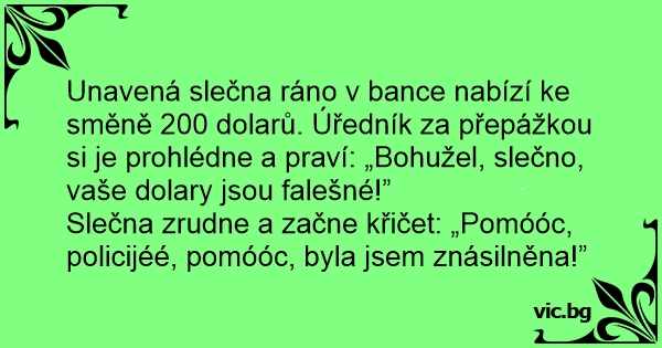 Unavená slečna ráno v bance nabízí ke směně 200 dolarů. Úředník za přepážkou si je prohlédne a praví: „Bohužel, slečno, vaše dolary jsou falešné!”