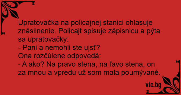 Upratovačka na policajnej stanici ohlasuje znásilnenie. Policajt spisuje zápisnicu a pýta sa upratovačky: