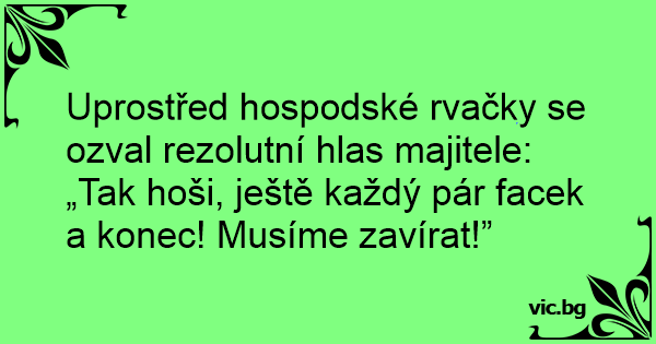 Uprostřed hospodské rvačky se ozval rezolutní hlas majitele: „Tak hoši, ještě každý pár facek a konec! Musíme zavírat!”