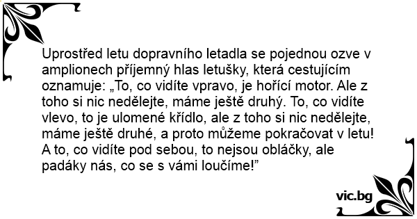 Uprostřed letu dopravního letadla se pojednou ozve v amplionech příjemný hlas letušky, která cestujícím oznamuje: „To, co vidíte vpravo, je hořící motor. Ale z toho si nic nedělejte, máme ještě druhý. To, co vidíte vlevo, to je ulomené křídlo, ale z toho si nic nedělejte, máme ještě druhé, a proto můžeme pokračovat v letu! A to, co vidíte pod sebou, to nejsou obláčky, ale padáky nás, co se s vámi loučíme!”