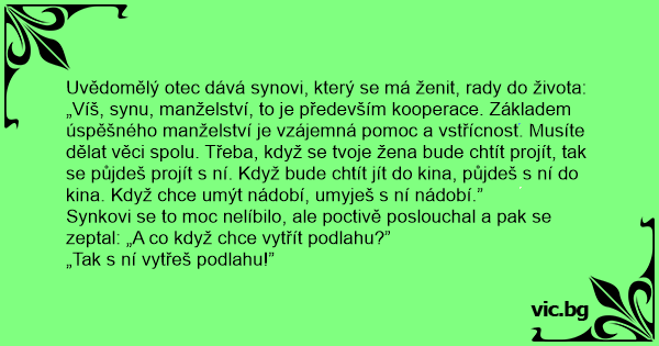 Uvědomělý otec dává synovi, který se má ženit, rady do života: „Víš, synu, manželství, to je především kooperace. Základem úspěšného manželství je vzájemná pomoc a vstřícnost. Musíte dělat věci spolu. Třeba, když se tvoje žena bude chtít projít, tak se půjdeš projít s ní. Když bude chtít jít do kina, půjdeš s ní do kina. Když chce umýt nádobí, umyješ s ní nádobí.”