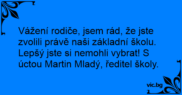 Vážení rodiče, jsem rád, že jste zvolili právě naši základní školu. Lepšý jste si nemohli vybrat! S úctou Martin Mladý, ředitel školy.