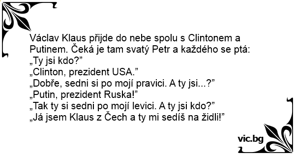 Václav Klaus přijde do nebe spolu s Clintonem a Putinem. Čeká je tam svatý Petr a každého se ptá: „Ty jsi kdo?”