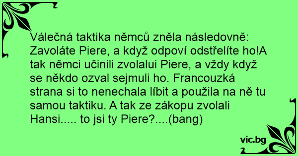 Válečná taktika němců zněla následovně: Zavoláte Piere, a když odpoví odstřelíte hо!A tak němci učinili zvolalui Piere, a vždy když se někdo ozval sejmuli hо. Francouzká strana si to nenechala líbit a použila na ně tu samou taktiku. A tak ze zákopu zvolali Hansi..... to jsi ty Piere?....(ваng)