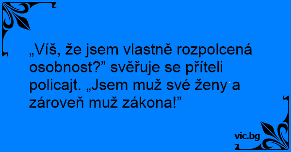 „Víš, že jsem vlastně rozpolcená osobnost?” svěřuje se příteli policajt. „Jsem muž své ženy a zároveň muž zákona!”