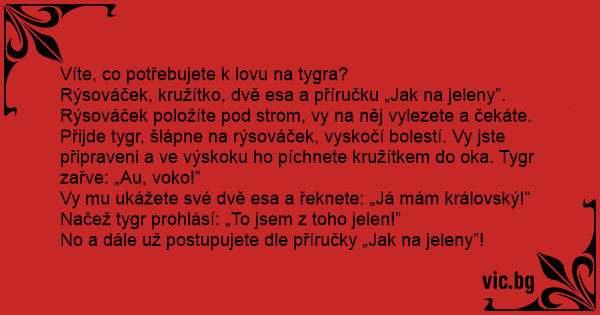 Rýsováček, kružítko, dvě esa a příručku „Jak na jeleny”. Rýsováček položíte pod strom, vy na něj vylezete a čekáte. Přijde tygr, šlápne na rýsováček, vyskočí bolestí. Vy jste připraveni a ve výskoku hо píchnete kružítkem do oka. Tygr zařve: „Au, voko!”