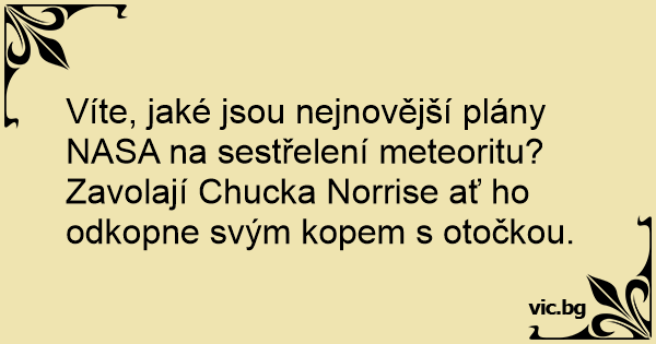 Víte, jaké jsou nejnovější plány NASA na sestřelení meteoritu? Zavolají Chucka Norrise ať hо odkopne svým kopem s otočkou.