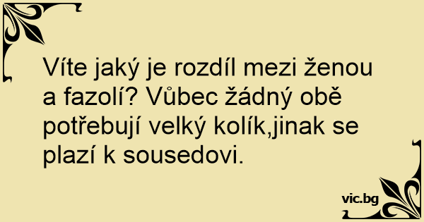 Víte jaký je rozdíl mezi ženou a fazolí? Vůbec žádný obě potřebují velký kolík,jinak se plazí k sousedovi.