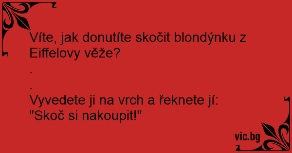Víte, jak donutíte skočit blondýnku z Eiffelovy věže? . . Vyvedete ji na vrch a řeknete jí: "Skoč si nakoupit!"